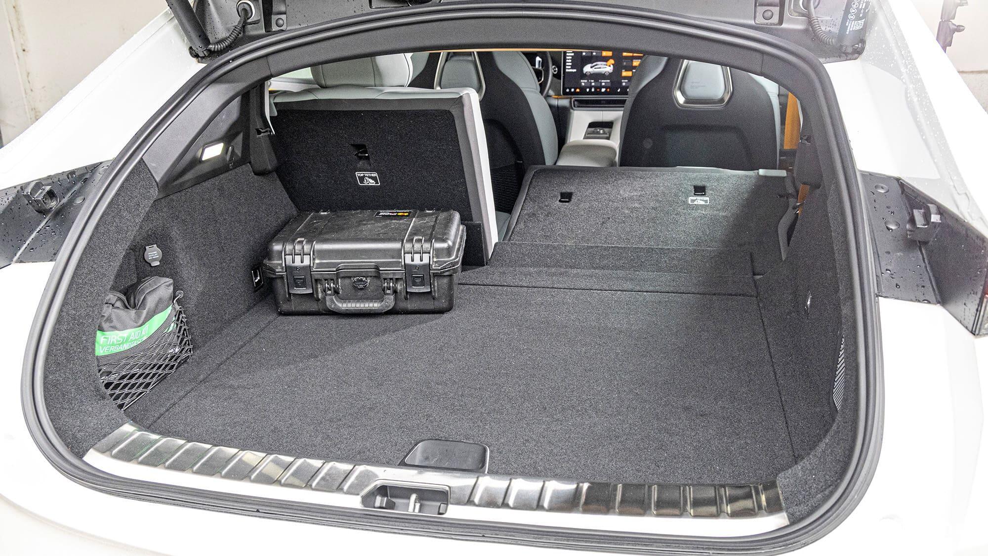 极星4的空间就显得紧凑得多。尽管配备了可调节的行李厢地板,其实用性和装载能力仍不及对手。后备厢容积为526~1536 升,但最大载重仅444千克(起亚:480~1250升,468千克)。