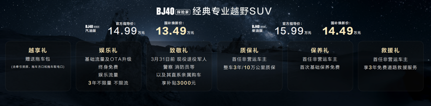 价格诚意也够足,BJ40探险家汽油版国补焕新价13.49万起,柴油版14.49万起,再加上价值1.2万的六重礼遇,性价比直接拉满。如今BJ40家族产品线愈发细分,2026款增程版和燃油版主打节能和时尚,面向以城市用户为主的市场面,而探险家则精准锚定硬核燃油越野需求。