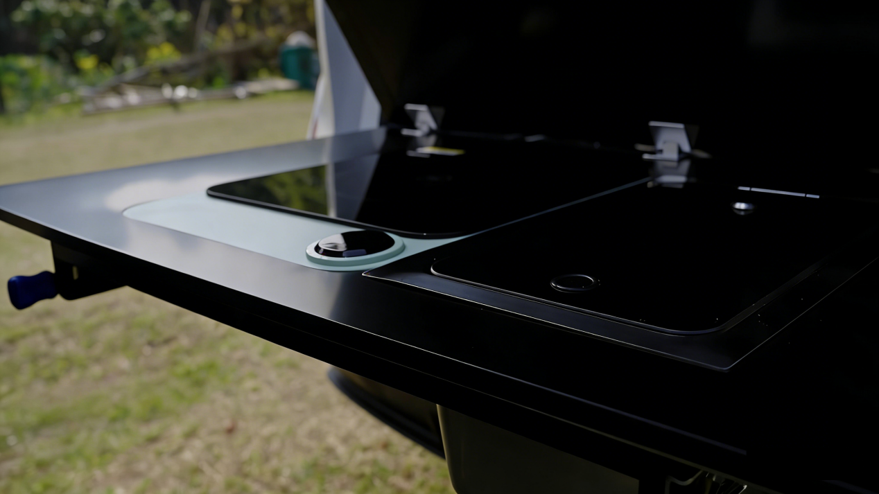 后备箱厨房采用模块化下沉设计,内嵌式电磁炉满足户外烹饪功率需求,可调节净菜池让操作流程更加顺畅,煎、煮、炖等多样料理场景均可轻松应对。