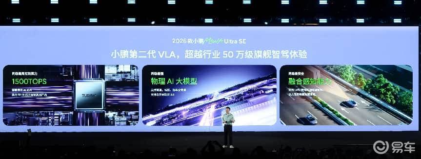 为满足不同用户的智驾需求,新车提供Max版和Ultra SE版双算力版本可选,兼顾高阶性能与实用体验,覆盖全场景出行。其中,Ultra SE版配备双图灵AI芯片,有效算力高达1500TOPS,搭载小鹏第二代VLA,这是一套面向L4时代的物理世界模型,不仅安心丝滑,全场景都能开,而且像老司机一样高效。而Max版搭载单颗图灵AI芯片,有效算力达750TOPS,目前搭载小鹏第一代VLA,2026年第三季度将开启小鹏第二代VLA蒸馏版上车,在驾驶体验、运行帧率、响应时延与稳定性等维度,完整保留小鹏第二代VLA的核心能力。