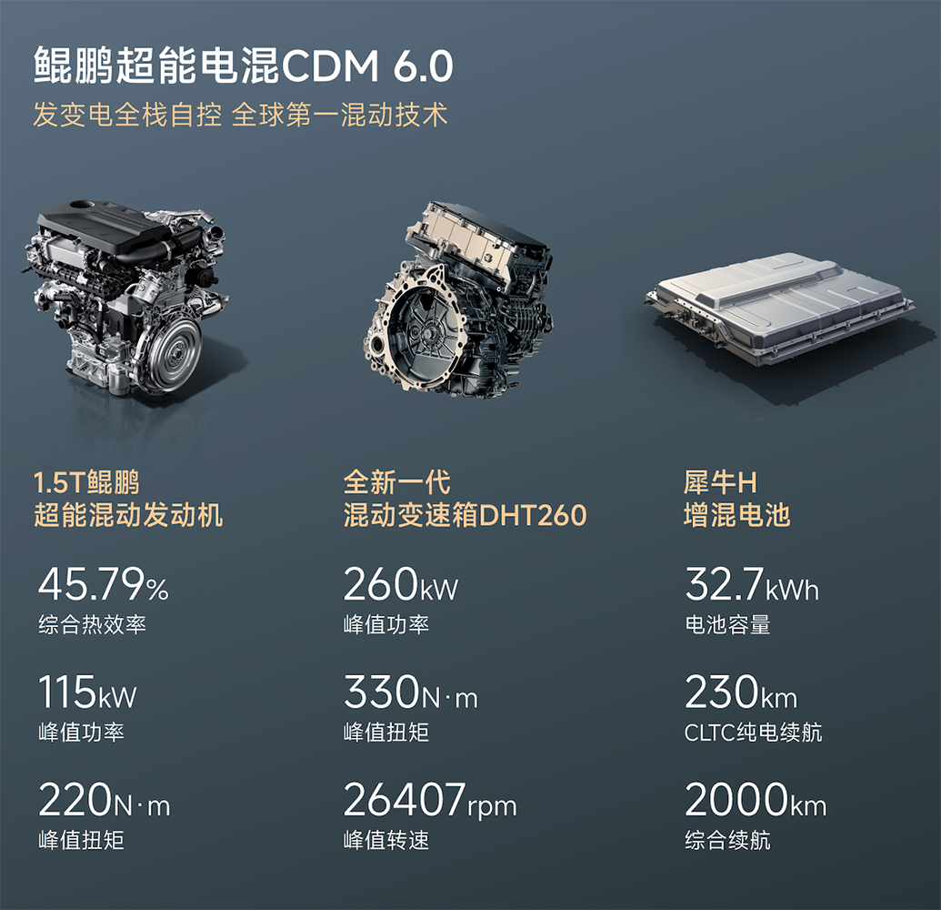 风云T9L搭载鲲鹏超能混动CDM 6.0系统。低配车型是1.5L发动机+160kW电机,配备DHT160变速箱,最大功率242kW。其他车型是 1.5T发动机+260kW电机,配备DHT260变速箱,最大功率375kW。电池使用了犀牛H增混电池,容量32.7kWh,CLTC纯电续航135公里和230公里,综合续航2000公里。