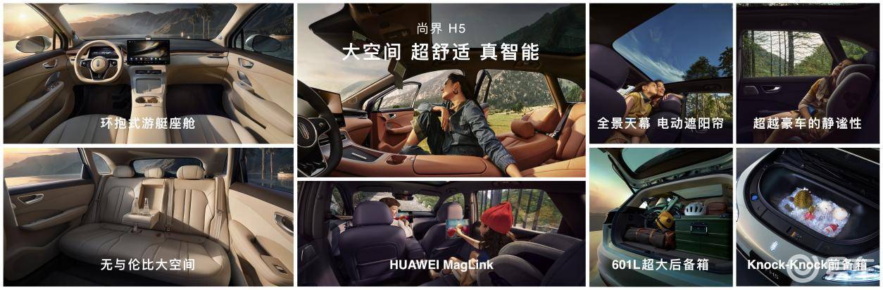 为打造远超同级的舒适,尚界H5以4780mm车长和2840mm轴距打造“三座平权”空间,后排腿部及头部空间均超1米,配备2.3㎡超大穹顶天幕,并通过100+项多级隔振降噪设计等带来超越豪华车的静谧性。储物方面,配备601L后备箱、124L前备箱,增程版、纯电版还分别配有65L、80L储物暗格,支持多元储物,满足全家出行需求。智能方面,鸿蒙座舱支持3D人脸识别、手机无感控车与沉浸式娱乐体验;上市即搭载华为乾崑智驾®ADS 4,并拥有192线激光雷达、4D毫米波雷达等构建起强大的全维感知能力,支持端到端领航辅助、驾驶员失能辅助等多项同级未有的功能。续航方面,增程版综合续航最高达1360km,纯电版综合续航655km。底盘融合上汽70年工程经验与HUAWEI XMOTION Control数字底盘引擎,麋鹿测试成绩78.3kph,百零制动距离34.2m,操控稳定且舒适。此外,新车还拥有远超同级的主被动安全,车辆越级支持eAES增强型紧急转向辅助,拥有超硬核车身、气囊安全、冗余安全等被动安全配置,电池配备高强度底护板、高强度侧边防撞设计等,实现全方位安全防护。