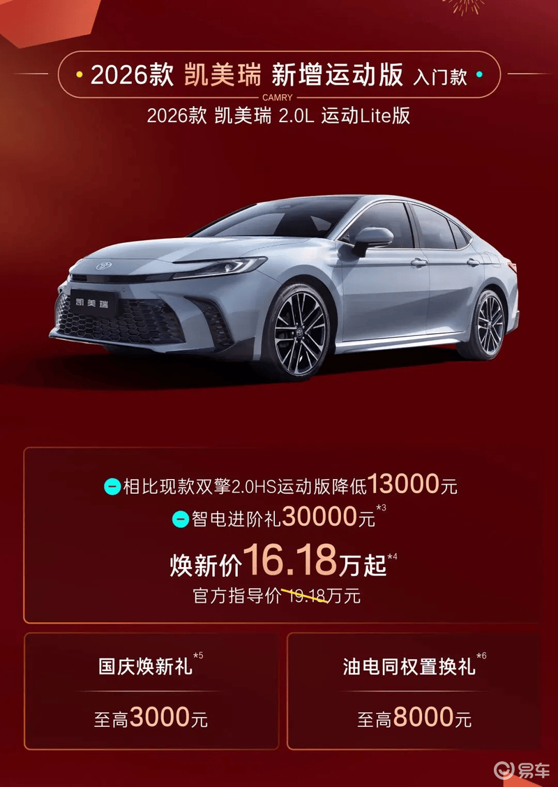 购买2026款凯美瑞新增运动版入门款可享受焕新价16.18万起,以及国庆焕新礼至高3000元和油电同权置换礼至高8000元。