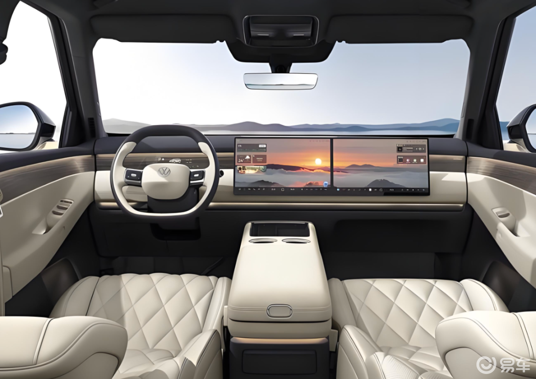 与众08的内饰设计跳脱出了当下ID系列那套相对保守的设计思路。前排采用了全液晶仪表屏和双14.96英寸车机屏+副驾娱乐屏组成的联屏布局。