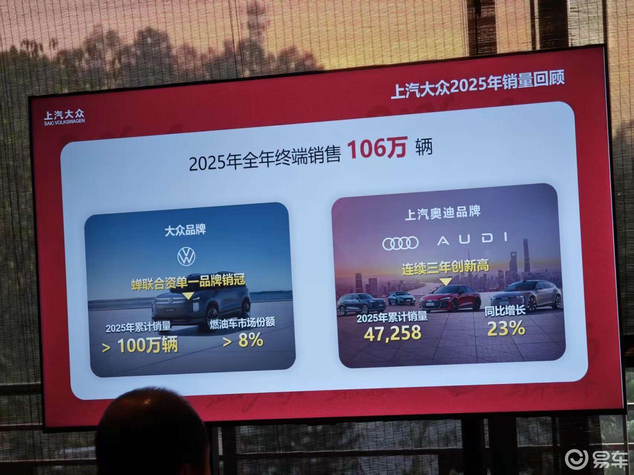 刚过去的2025年,当整个汽车行业都在为“增量不增收”而焦虑时,上汽大众却交出了一份堪称“凡尔赛”的成绩单。全年终端销量106万辆,稳稳坐在“百万俱乐部”的VIP席位。大众品牌更是以超百万辆的销量,蝉联合资品牌单一销量冠军,并且燃油车市占率逆势攀升至约8.7%,成为单一品牌燃油车市场的“销量王者”。