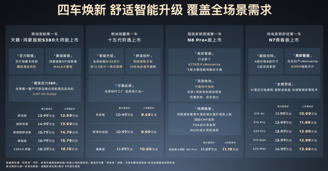 其中,十五代轩逸推出3款车型,上市限时价9.49—10.99万元;天籁·鸿蒙座舱S380大师版上市限时价16.19万元;N6 180 Pro+搭载宁德时代电池和Momenta高阶智驾,上市限时价11.19万元;N7全系焕新青春版,上市限时价10.99—13.99万元。