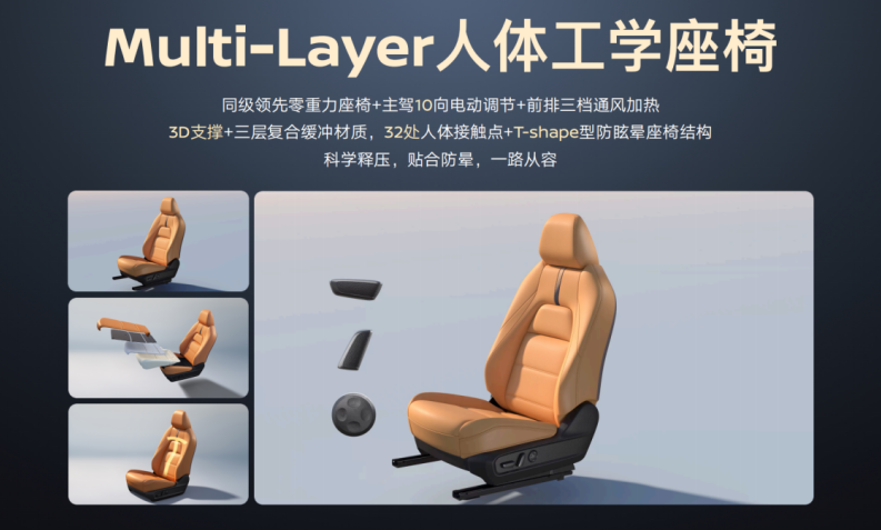 舒适方面,N7青春版搭载行业首创的AI零压云毯座椅,加上行业首创的全域智能防晕车系统,全家出行,舒适加倍。