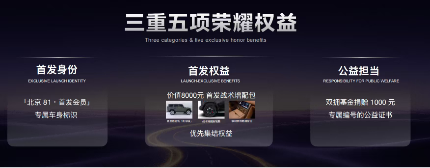 - 盲订且最终购车的用户,将获授「北京 81・首发会员」荣誉身份,并授予线上勋章和实体徽章。首发车型将在车身多处,镌刻首发车印记,打造专属身份标识。